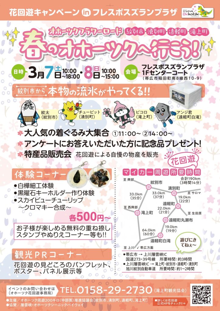 3月7日(土)と8日(日)の二日間、帯広市「フレスポスズランプラザ (1Fセンターコート)」において、紋別市・滝上町・遠軽町・湧別町の春の魅力をたっぷりとお届けいたします。