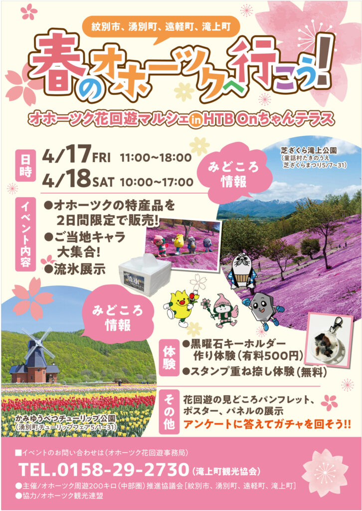 紋別市、滝上町、遠軽町、湧別町の観光PRコーナーや特産品販売、体験コーナー、さらに各地のご当地キャラクターも登場!
